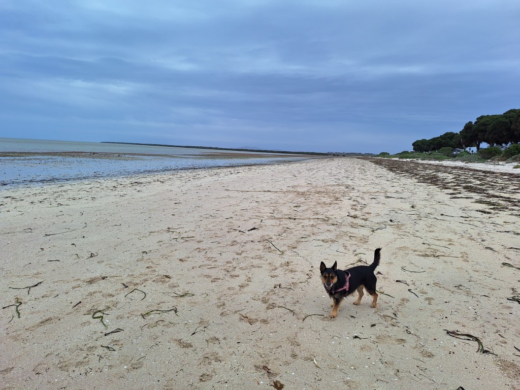 I got Dad up about 6:30 for my walk and there are a few breaks in the cloud. We finally had breakfast which Dad cooked on the BabyQ and we sat outside to eat it. This is the first time in 8 weeks we have been able to do this. The car is now fueled and the fridge stacked ready for Day one on the Nullabor. The rest of the day has been cloudy but warm and on my evening walk we saw a dolphin playing with it’s food (Octopus) in a flat as a pancake bay. It’s now 8:17 and i am laid in Dad’s place on the bed as the sun set’s.